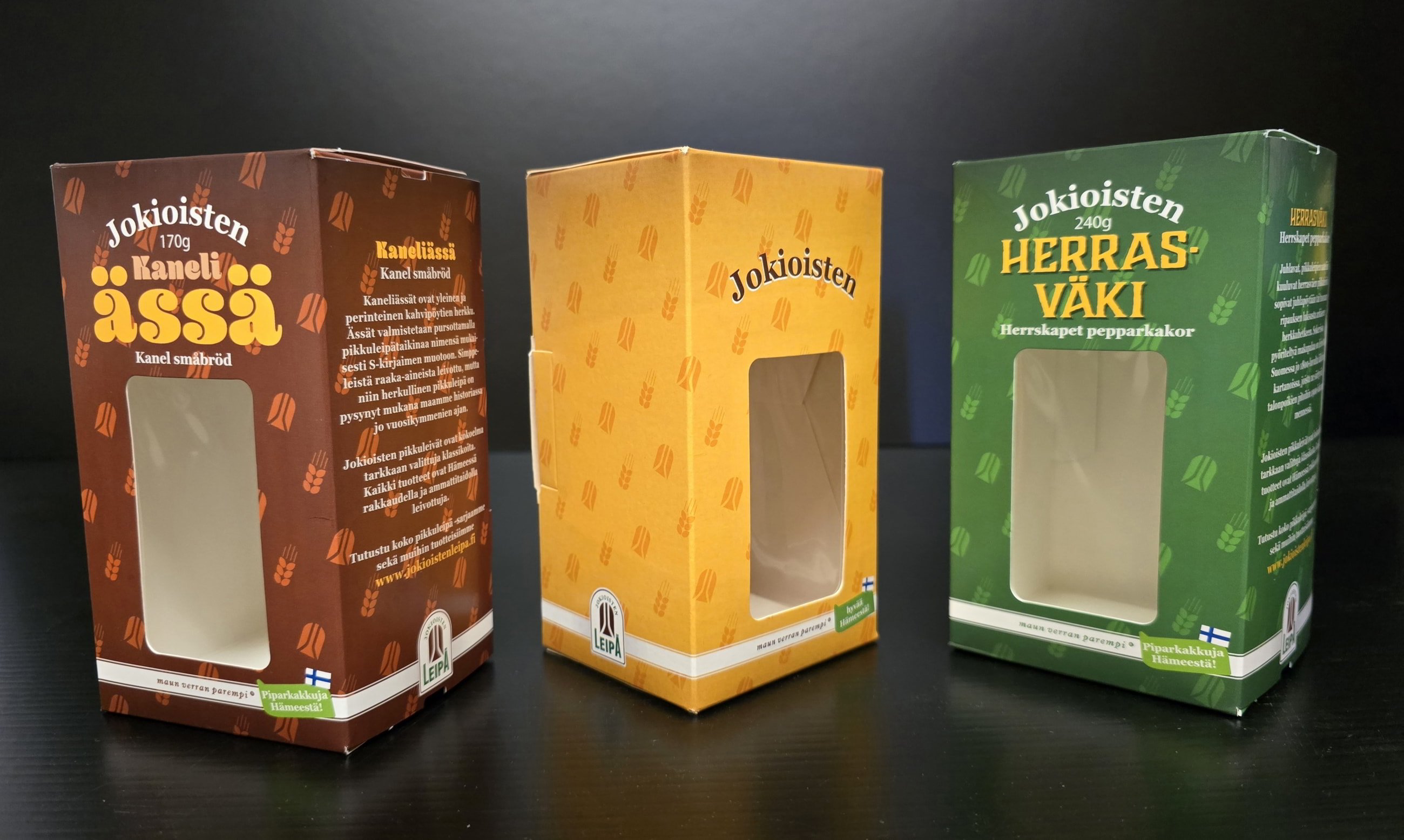 Samalla tuoretuotteiden pakkauksilta vaaditaan visuaalisuutta ja brändinmukaisuutta: “Pakkaus viestii asiakkaalle, mitä Jokioisten Leipä on.”
