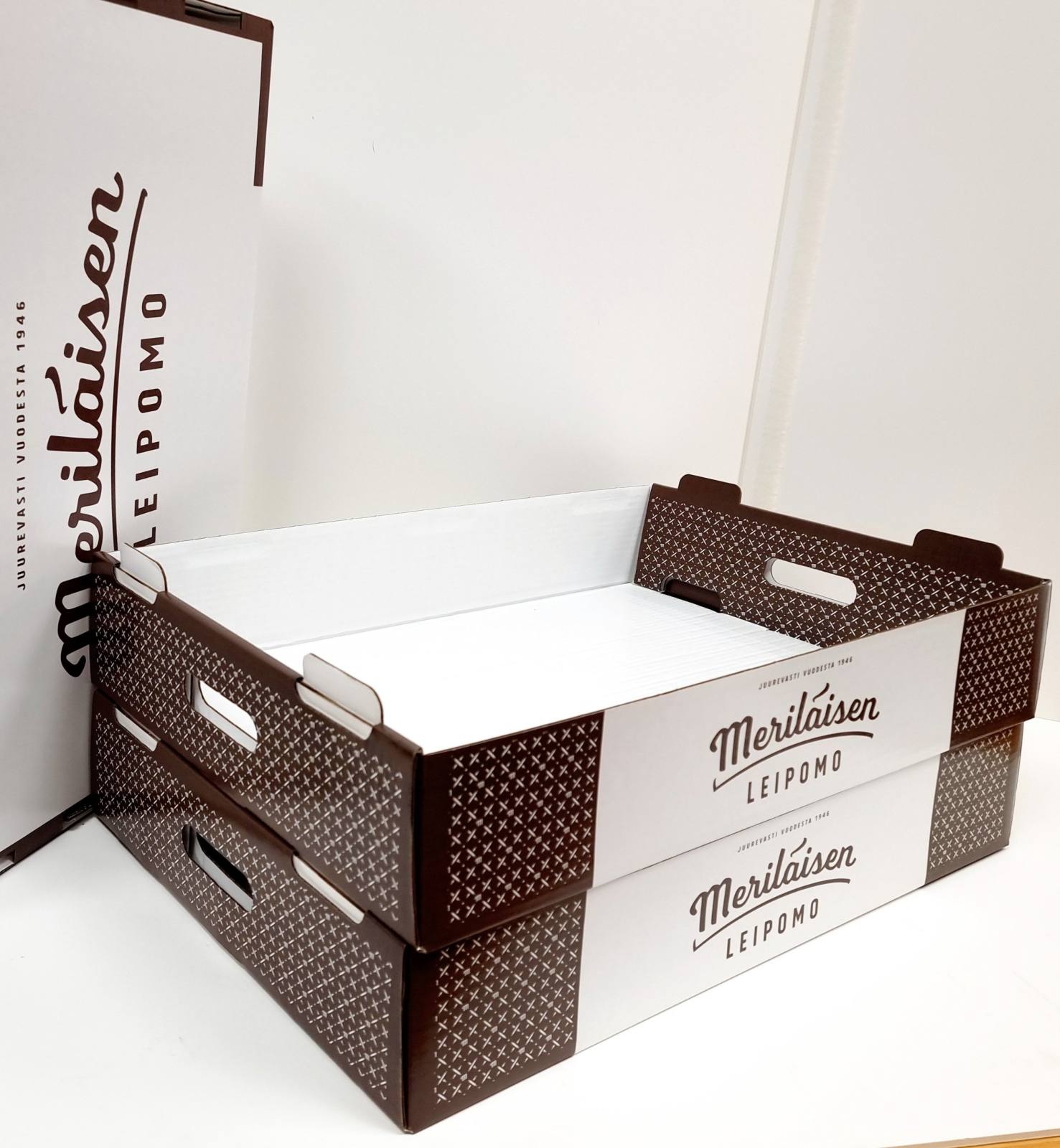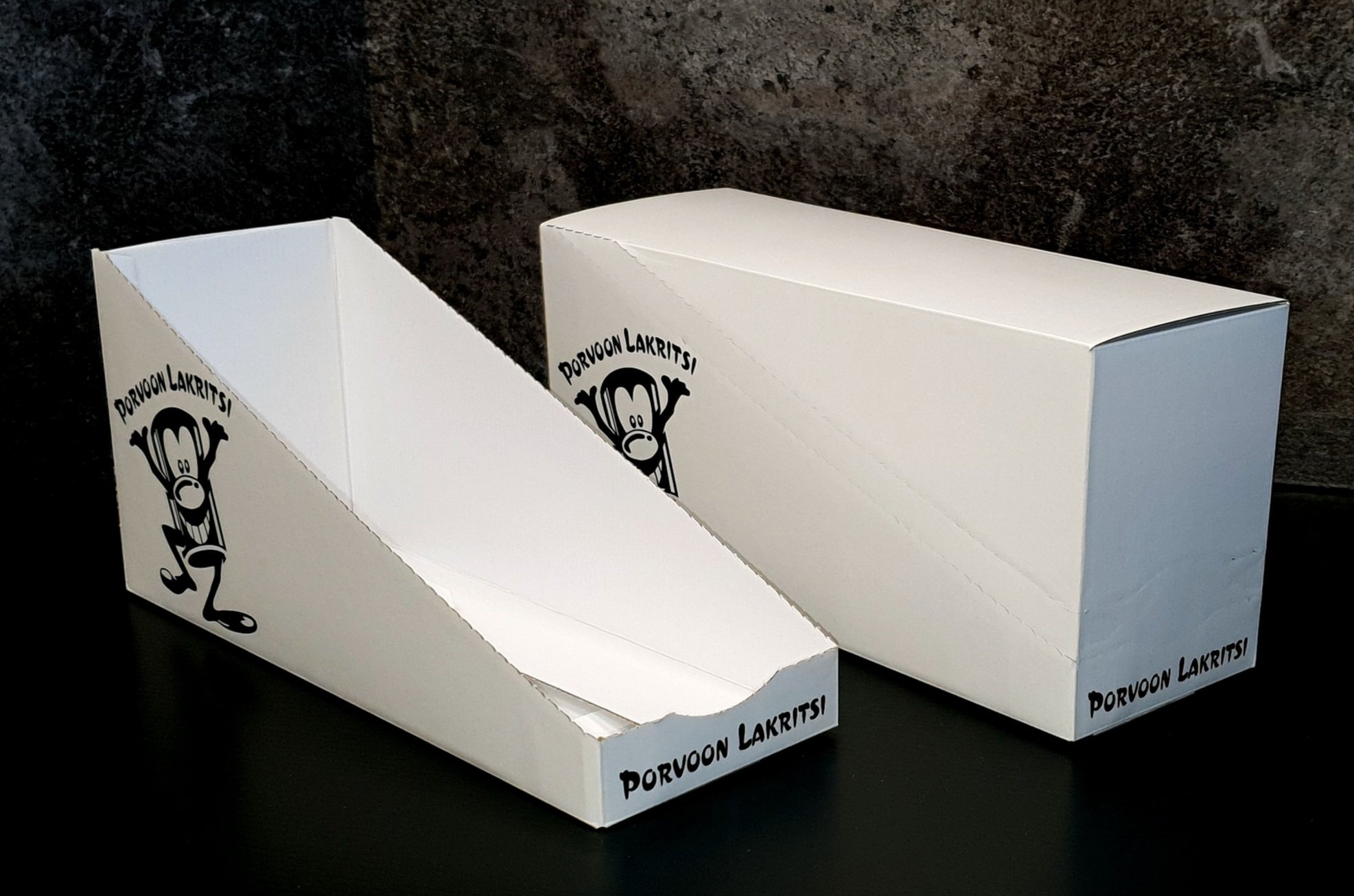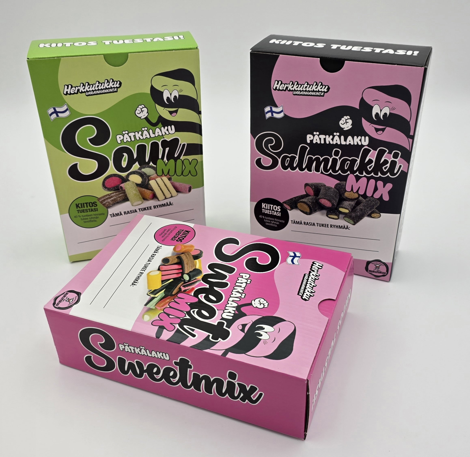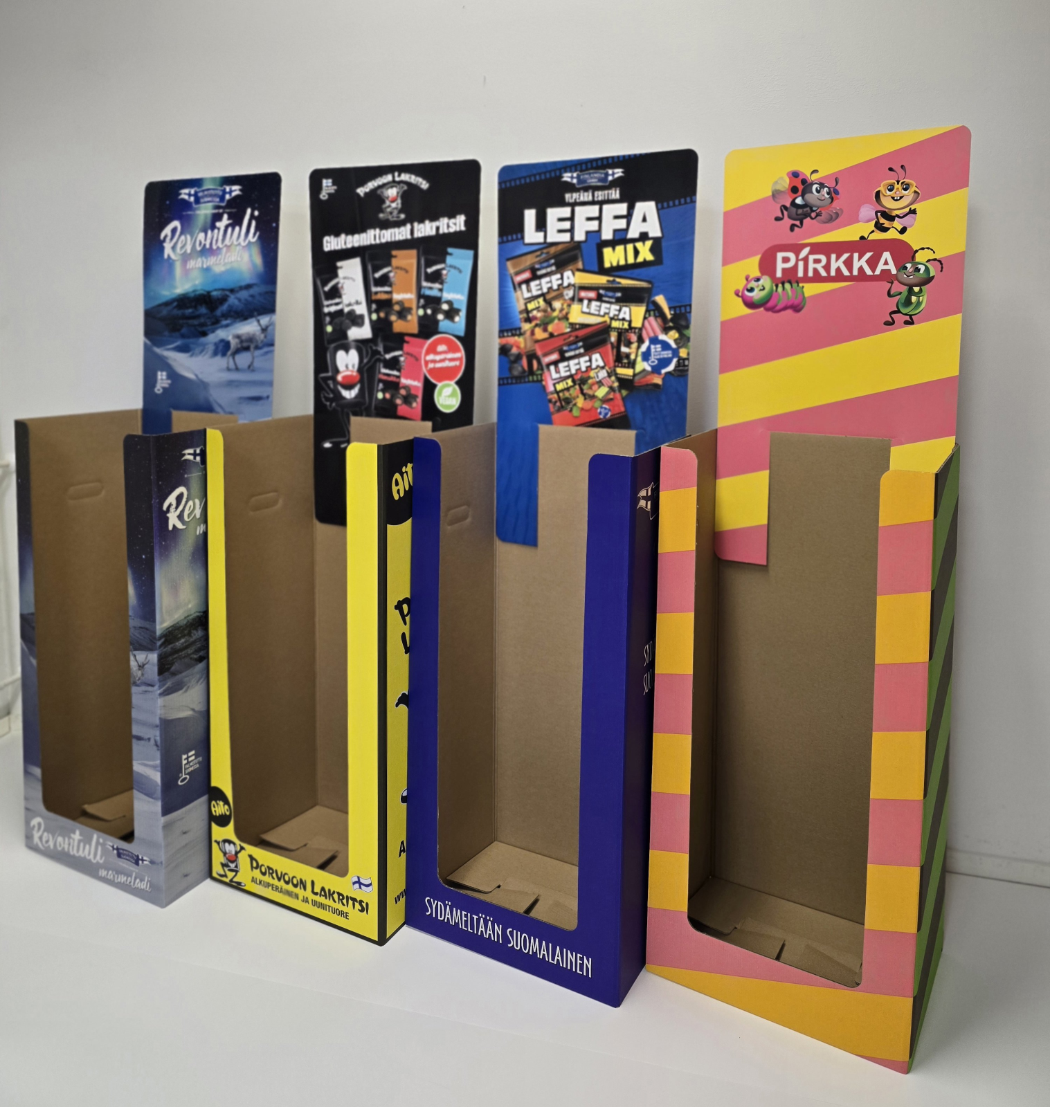 Sivuliimatut herkulliset tuotepakkaukset, offsetpainatus ja kaseeraus. Materiaalina aaltopahvi ja kartonki.