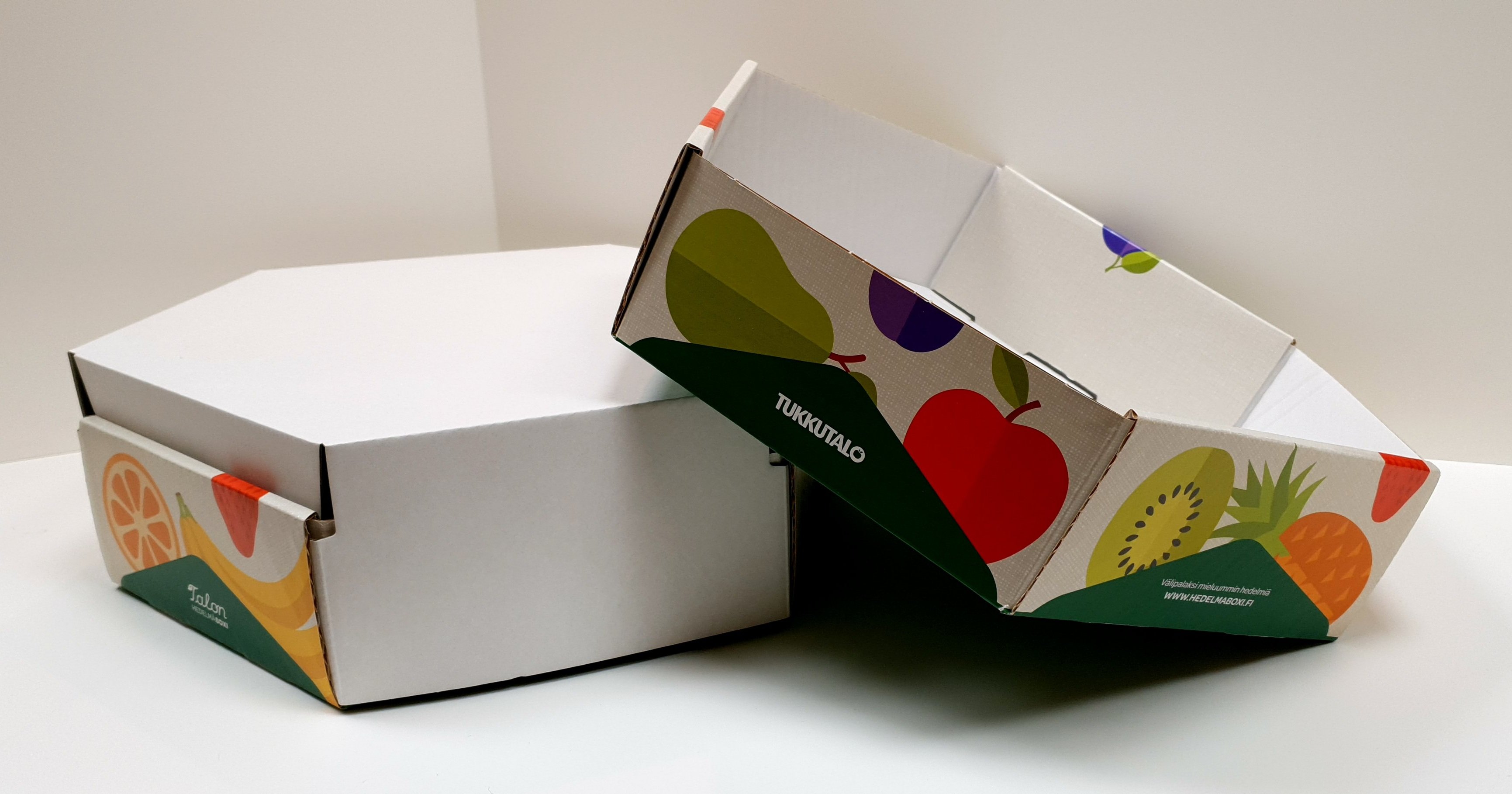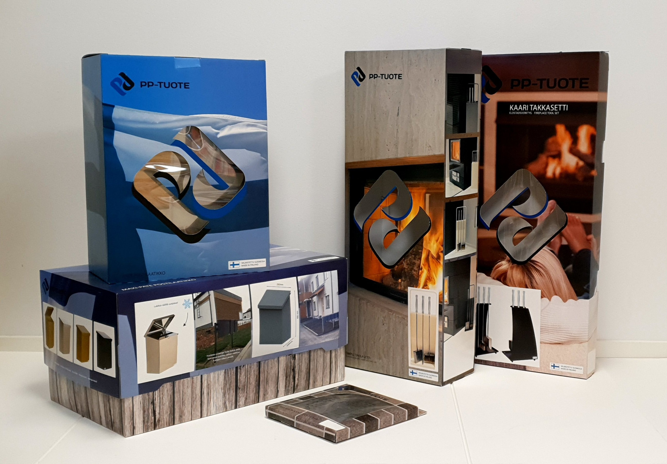 Tuotepakkauksia isommillekin tuotteille, kaunis offsetpainatus ja tukevuutta tuova kaseeraus. Materiaalina aaltopahvi ja kartonki.